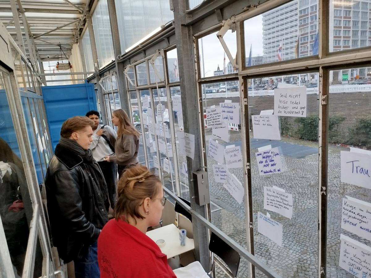 Im gläsernen Pavillon entstanden Schreibgespräche und moderierte Runden. Jugendliche und Erwachsene hielten fest, was sie bewegt: Was hat sich eingegraben? Was bleibt als Sorge oder Trauer? Welche Hoffnungen und Wünsche richten sich an Politik, Schule und Stadtteil? Wo gelingt es im Alltag, Konflikte ohne Gewalt zu lösen? Der Ort war durchgehend gut besucht, viele blieben, hörten zu und brachten eigene Gedanken ein.